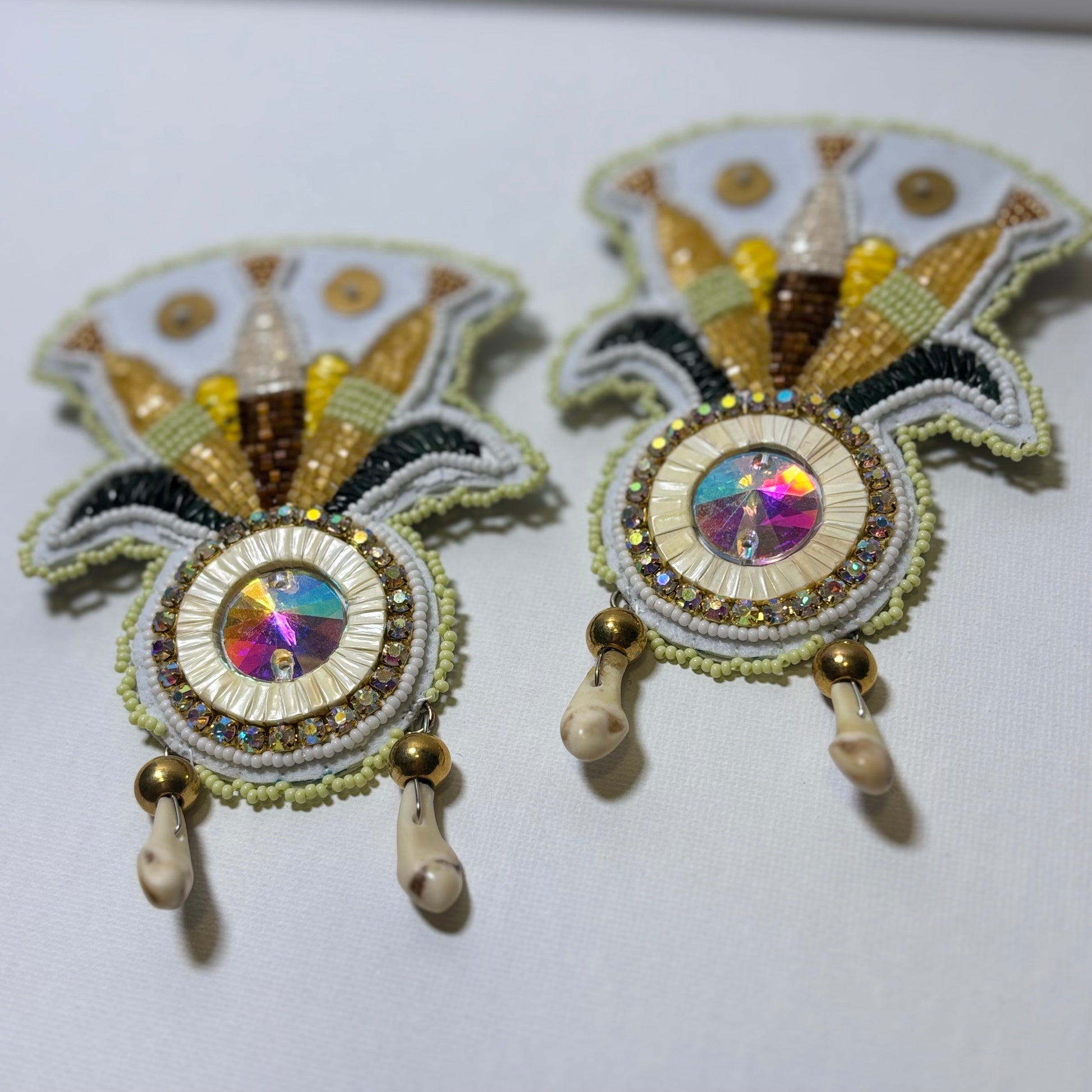 These striking earrings feature North American porcupine quills intricately crafted using two distinct techniques: the bold zigzag and the elegant wrap. At the center, a 20mm crystal adds radiant sparkle, beautifully framed by shimmering brass sequins. Accented with mini genuine ivories, these earrings blend natural elements with refined craftsmanship for a truly unique and eye-catching accessory.