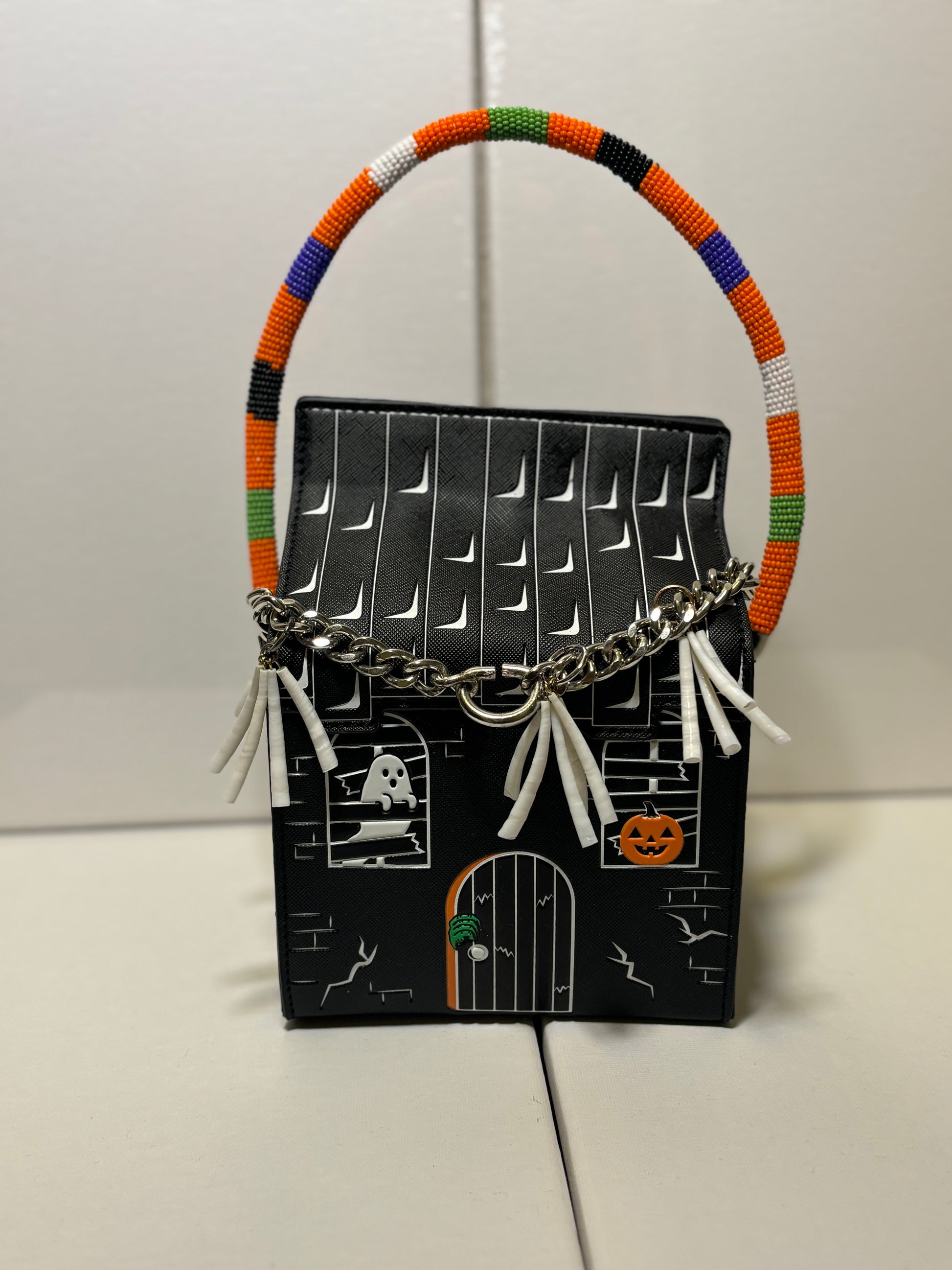 Welcome to the cutest haunted house on the block! This Spooky Indigenous House bag brings all the cozy-spooky vibes with its unique shape and orange beaded handle, topped off with bundles of Dentalium shells for a touch of traditional flair.