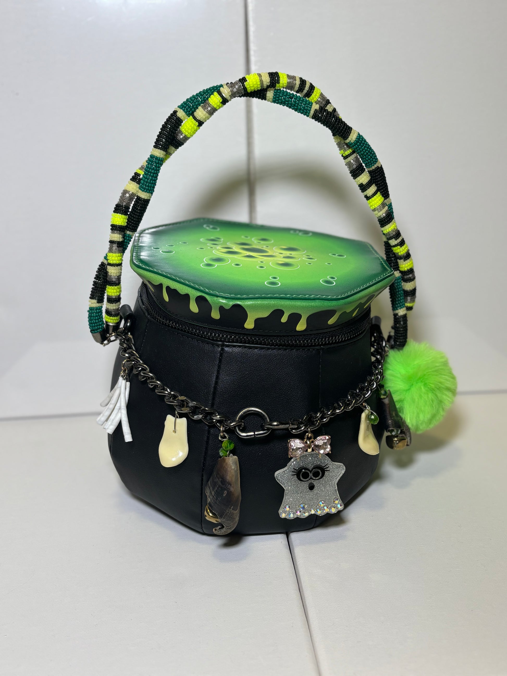 A little spooky, a little sparkly, and totally magical! This Spooky Cauldron Bag is the perfect mix of cute and creepy. It features a twisted beaded handle and fun embellishments like deer, elk, and Dentalium shells- plus a glittery ghost and a neon puff for that extra pop of personality.